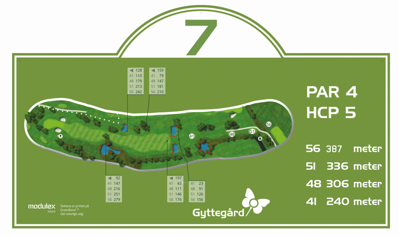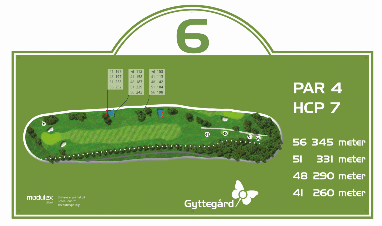 Blå plade i fairway 50 meter til midt green